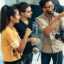 Photographer explaining about the shot to his team in the studio. Photographer talking to his assistants holding a camera during a photo shoot.